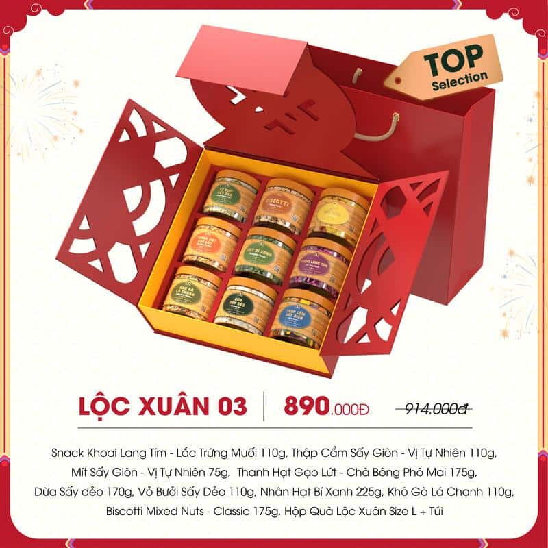 Hộp quà Tết Lộc Xuân 03 gửi gắm lời chúc năm mới thịnh vượng, tài lộc và may mắn. Mẫu mã của phần quà Tết này rất độc đáo với thiết kế vỏ hộp trông khác biệt, lạ mắt đảm bảo khiến người nhận cảm thấy thích thú. Ngoài ra, các sản phẩm chứa đựng bên trong cũng rất chất lượng và cao cấp khiến cho mâm bánh kẹo ngày Tết càng thêm phong phú và đa dạng.